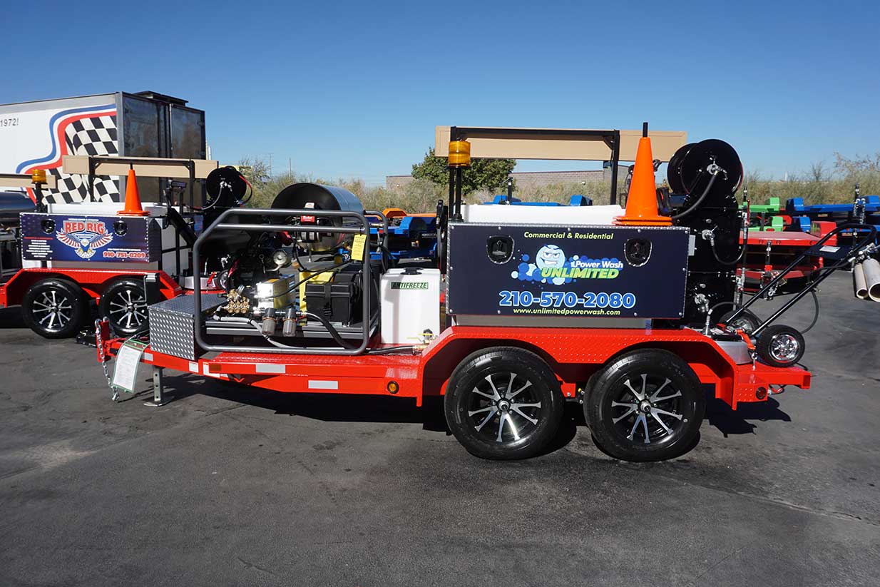 Power wash trailers for sale by Power Line Industries have set the standard in pressure wash trailers for over 30 Years. We ship power wash trailers to California, Texas, Florida and worldwide. Power Line can custom build your mobile power wash rig.